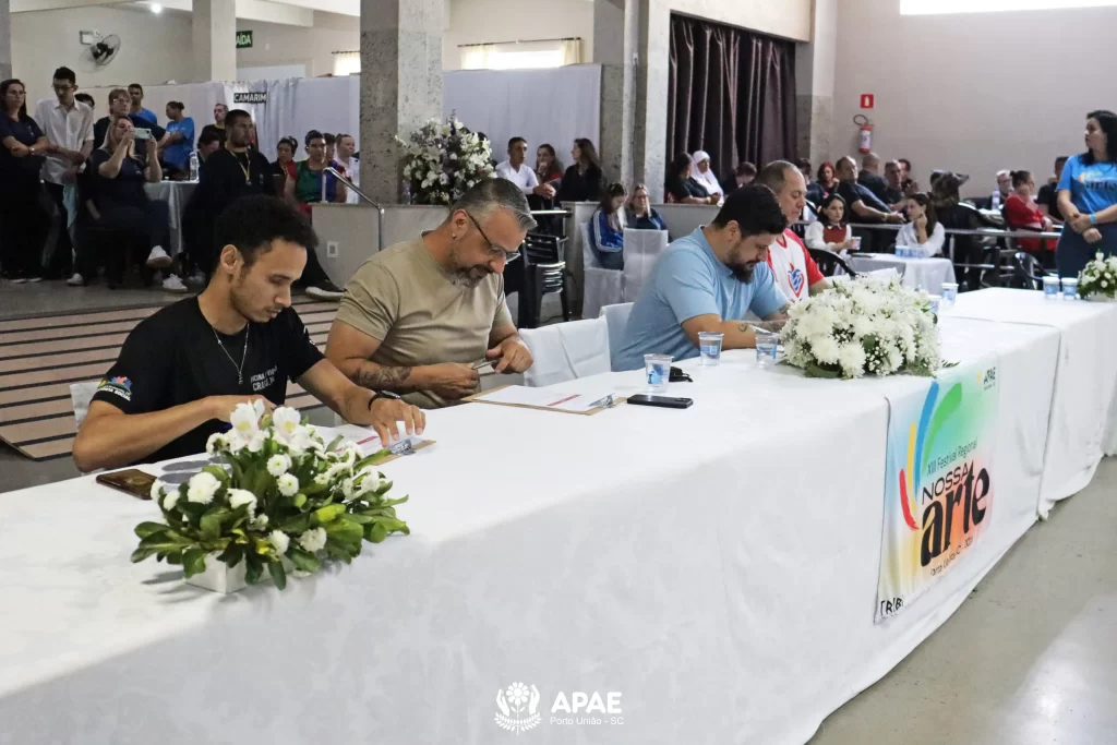 A cerimônia de abertura contou com o desfile das bandeiras de cada APAE participante e a composição da mesa de autoridades. O momento ganhou ainda mais brilho com o Coral Mãos que Cantam, da APADAF/SC, que interpretou o Hino Nacional em Libras. O cerimonial ficou a cargo do professor Aluízio Witiuk, que conduziu o protocolo com leveza, elegância e bom humor.