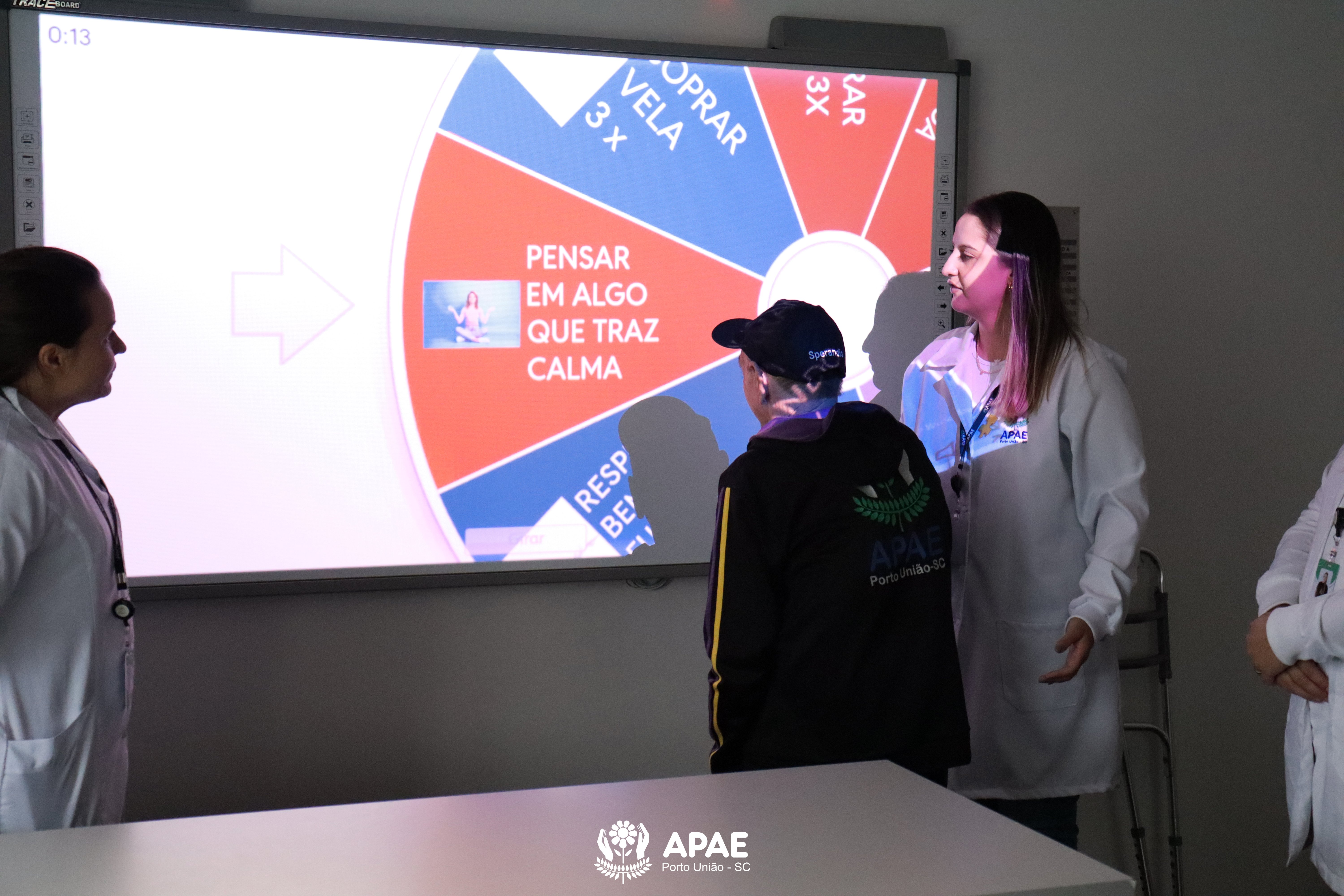 A fonoaudióloga Ariele, juntamente com a assistente social Bruna e a enfermeira Paula, levaram as turmas até a sala de Informática Educativa para que, na lousa digital, elas participassem de um jeito divertido de lidar com a ansiedade: a roleta da calma.